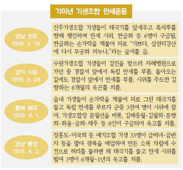 일제 강점기 시절 권번(일제강점기의 기생조합)에 소속돼 있었던 기녀들도 기생조합 통해 조직적이고 체계적인 시위를 전개했다. 3·1운동 당시 만세 시위에 적극적으로 참여한 기생들은 다양한 예술적 기능과 학식을 갖춘 정통적인 예기에 해당하는 여성들로 당시 ‘사상기생’이라 불리었다.